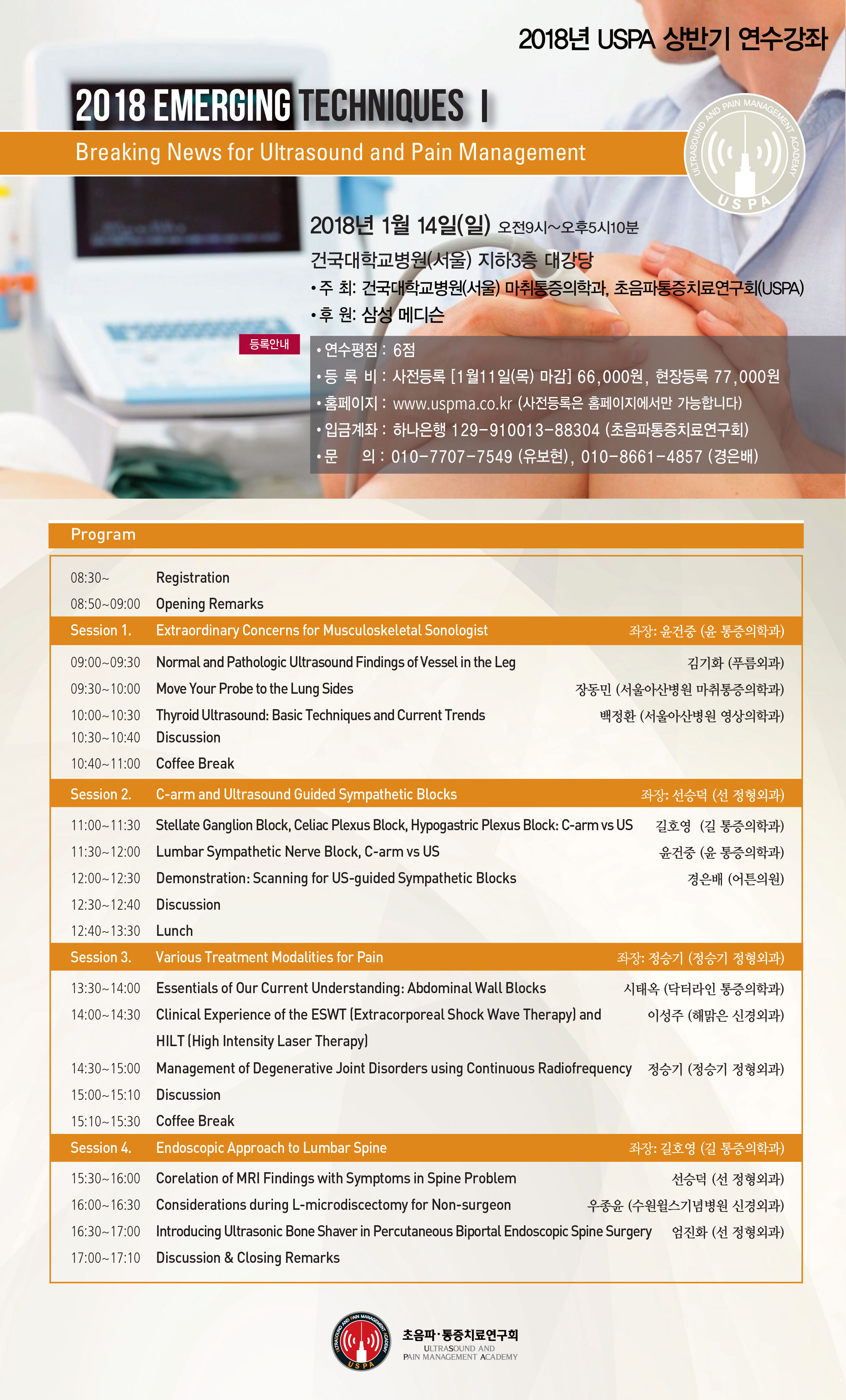 [연수강좌] [1월14일(일)] 2018 상반기 연수강좌 : Breaking News for Ultrasound and Pain Management