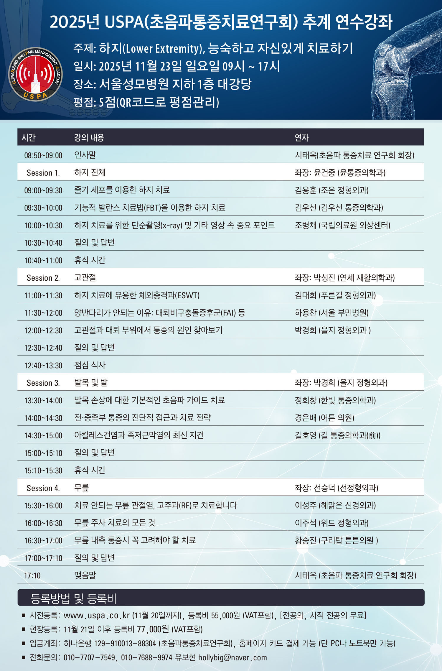 [연수강좌] [11월 23일 (일)] 2025 USPA 추계 하반기 연수강좌 - 하지, 능숙하고 자신 있게 치료하기 (전공의, 사직전공의 무료)